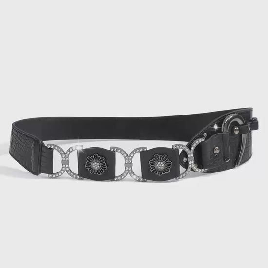Gothic Bohemian Leather Belt – Black Croc-Embossed Wide Waist Belt with Alloy Buckle & Rhinestone Accents