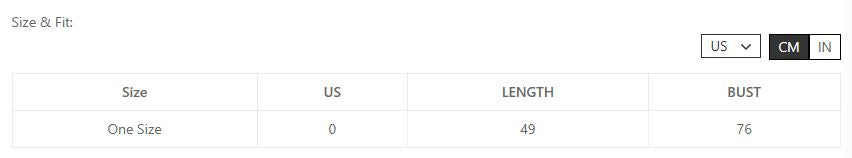 | Size | US | Length | Bust |