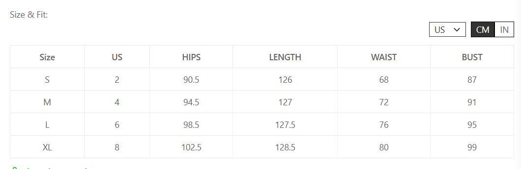 | Size | US | Hips (cm) | Length (cm) | Waist (cm) | Bust (cm) |