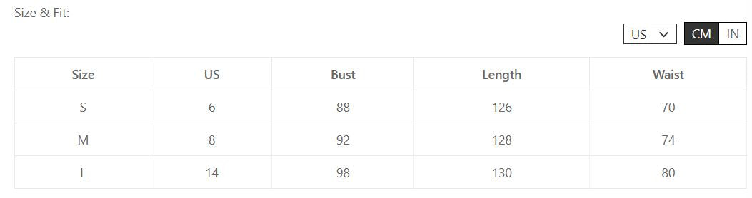 | Size | US | Bust (cm) | Length (cm) | Waist (cm) |